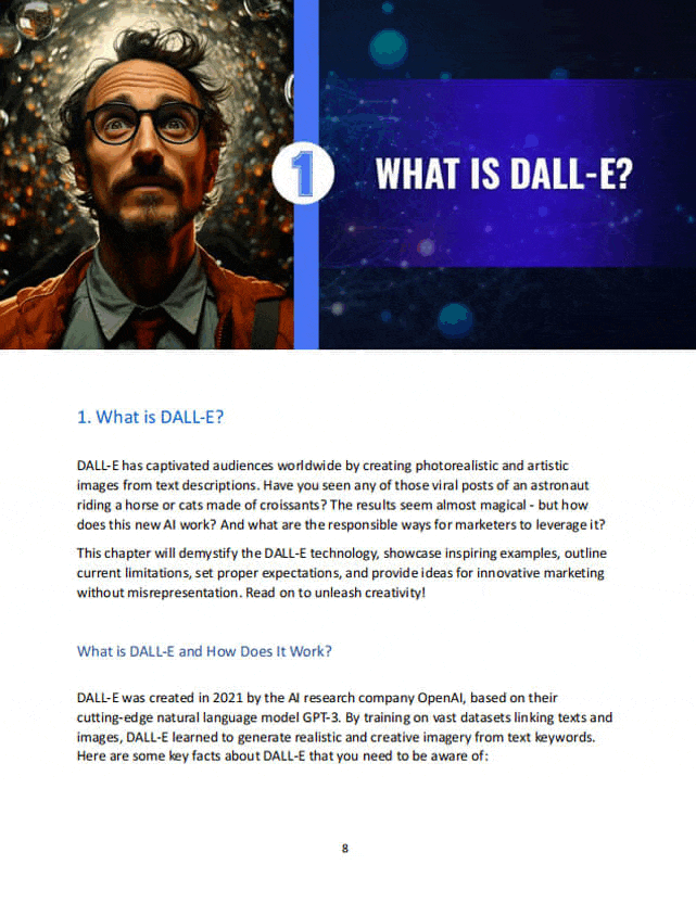 Immerse yourself in our expertly crafted eBook that unveils the secrets of harnessing AI for innovative marketing. This guide dives deep into how to use DALL-E, an AI-driven tool, to create stunning marketing visuals and strategies without the need for extensive design skills. It's brimming with cutting-edge AI insights, practical tips, and techniques that can transform the way you approach marketing, helping you to earn recognition and revenue in the digital space. With clear, easy-to-follow steps and real-world examples, this guide is your express route to marketing success in the AI era.